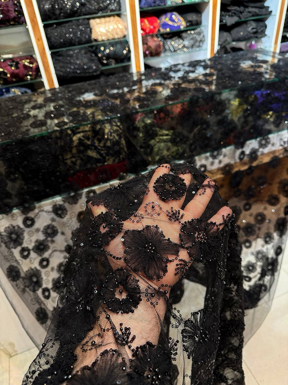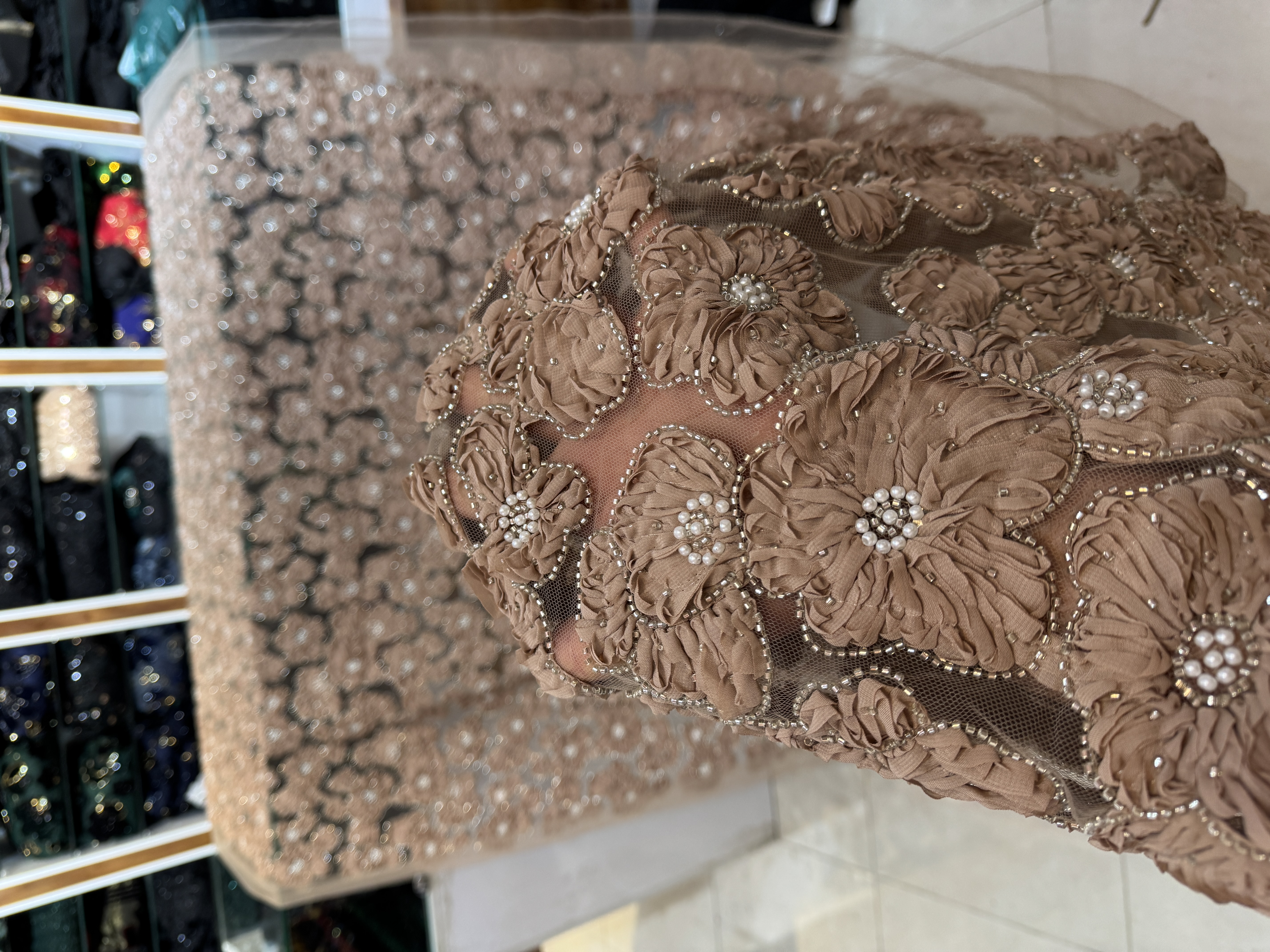 پارچه تور گل برجسته مروارید دوزی | عرض ۱۵۰